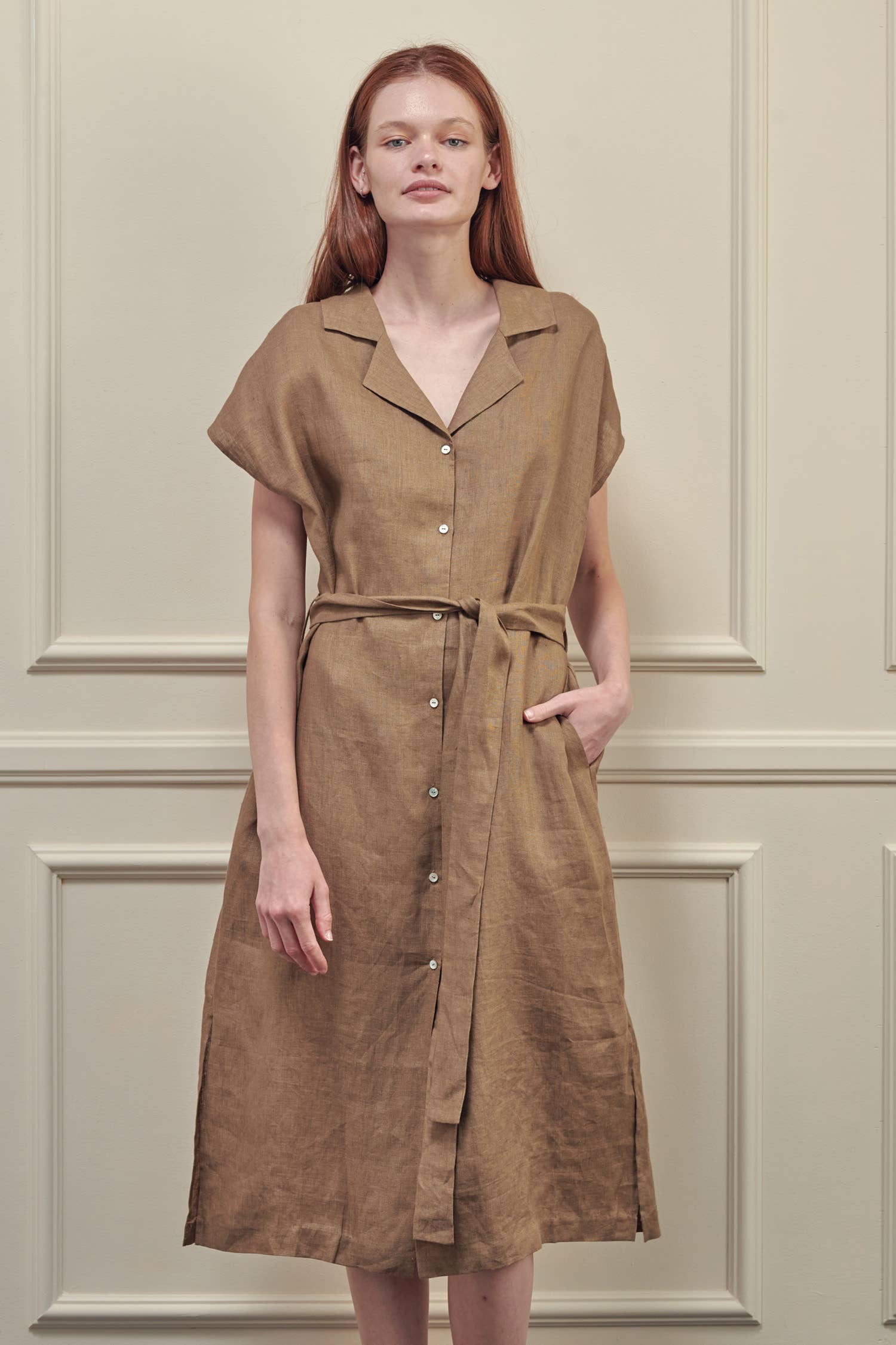 This button-front midi dress is featured in a shirt-inspired silhouette.