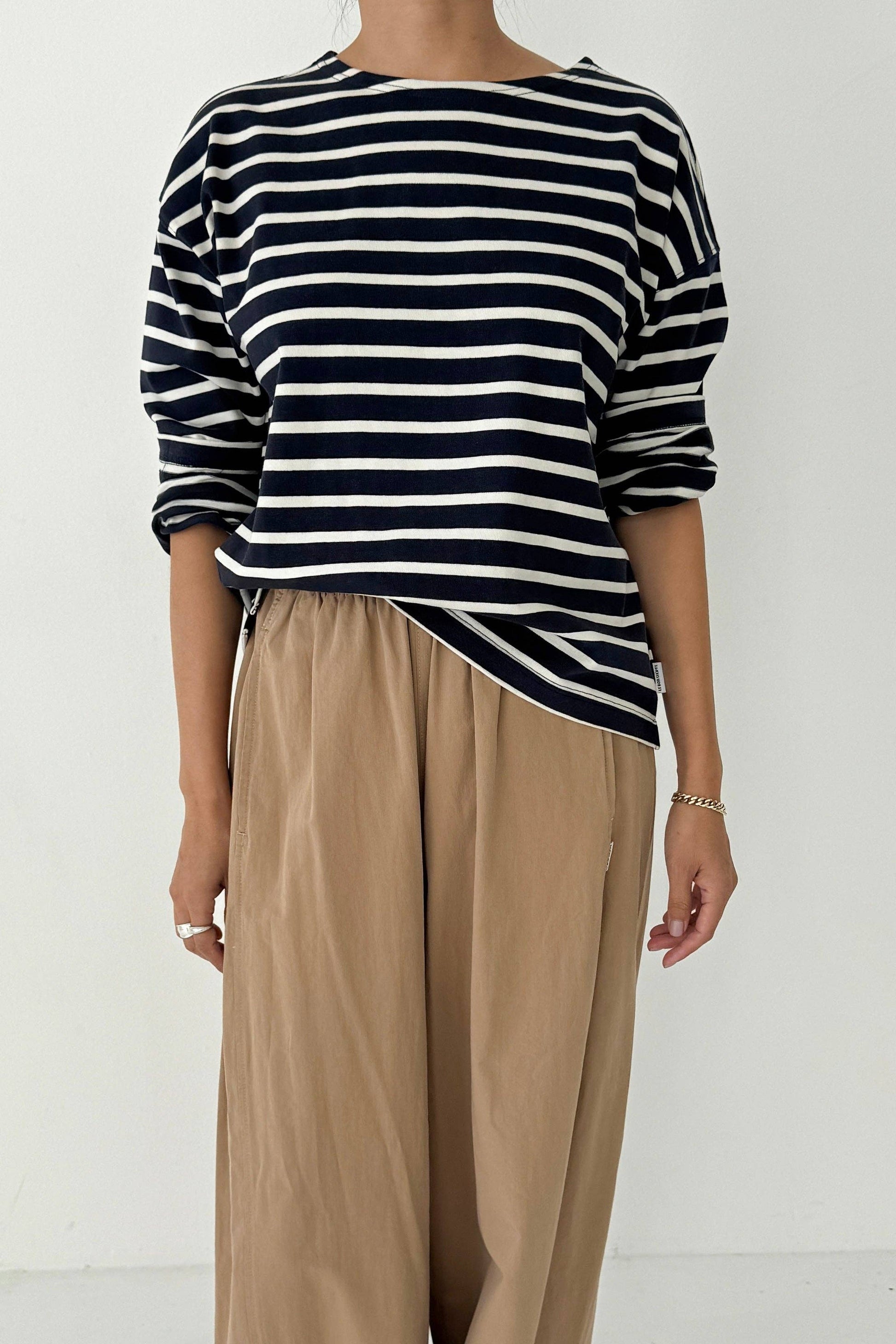 Why We Made This? A nautical long sleeve with a classic fit. The Sailor Top takes design cues from the Marseille Top, featuring a Breton stripe and boxy shape, but updated with a flattering round neckline and a slightly cropped length that pairs effortlessly with high-waisted bottoms. Contents: 100% Cotton Heavy Cotton Stripe Care Instructions: - Washing these garments only with like colors and in cold water - Recommend to Hang Dry for the best result! Approximate Measurements: XS/S : Chest 21", Length 22" M/L : Chest 22 1/2", Length 22 1/2" Model is 5' 6", Bust: 34", Waist: 27", Hip:36" and wearing a size XS/S Made in South Korea